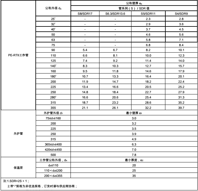 一、預(yù)制直埋PERTⅡ型保溫管的規(guī)格尺寸應(yīng)符合下表技術(shù)參數(shù)。