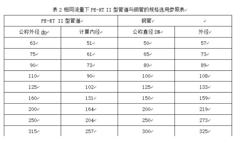 與鋼管比較,PE-RT II型管道的摩擦阻力小,同樣內(nèi)徑的管材流量是鋼管的1.25倍,隨著鋼管的腐蝕,內(nèi)壁會變得更加粗糙,流量也會逐年降低,相同流量的情況下,PE-RT II型管道與鋼管的規(guī)格選型見表2