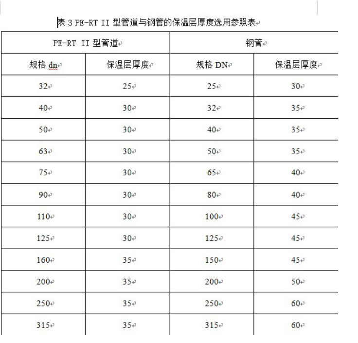 PE-RT II型供熱管道與鋼管相同,都采用工作管、保溫層、外護管三位一體的保溫結(jié)構(gòu),由于PE-RT II型材料的導(dǎo)熱系數(shù)為鋼管的1%,即管材本身具有較好的保溫性能,且PE-RT II型管道、保溫層、外護管的熱膨脹系數(shù)基本一致,會成為一個整體,不易分層、脫落,管道保溫效果優(yōu)于鋼管,在相同的外界溫度條件下,更節(jié)約保溫材料。以輸送80℃熱水為例,相同流量的外界溫度下,PE-RT II型管道與鋼管的保溫層厚度選型見表3